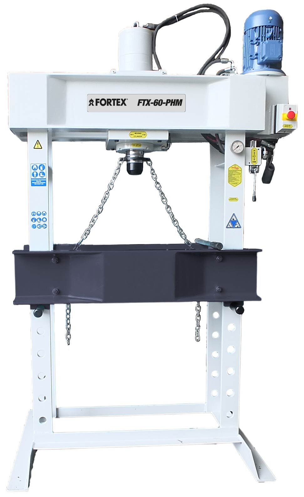 Prensa robusta con construcción en acero, eje de acero inoxidable con recubrimiento de cromo endurecido. Incorpora sistema de seguridad del pistón, herramienta de empuje, mesa inferior móvil, interruptor de seguridad para el motor y botón de parada de emergencia.