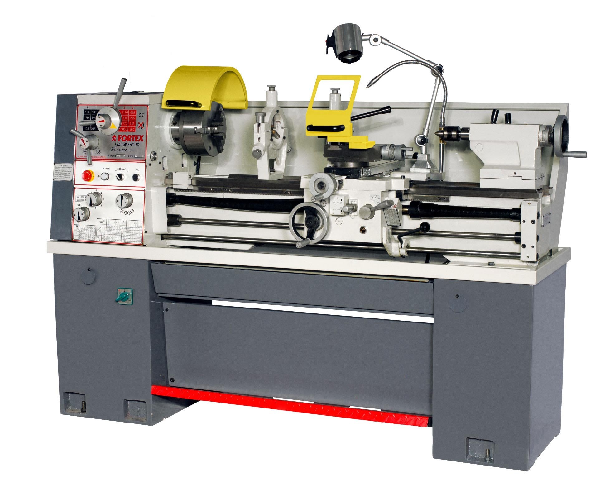 Torno profesional, de robusto diseño con guías prismáticas laminadas y rectificadas. Con eje de guía para avances automáticos. Microinterruptor de paro por apertura de tapa de poleas o protector plato. Protector de plato de garras y torreta. Paro de emergencia. Freno de pie. Dial indicador de rosca. Tope de carrera avance longitudinal del carro. Máquinas fabricadas según normas CE.